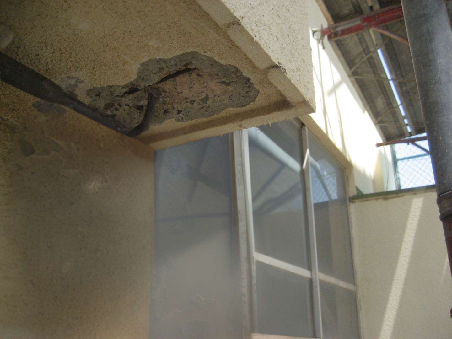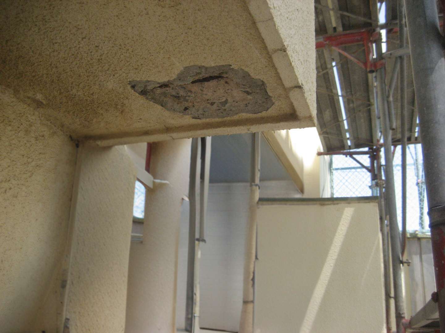 上裏コンクリートの落下を受け、脆弱部をあらかじめはつり取ったうえで、鉄筋の防錆処理を行い、その後エポキシ樹脂系の軽量モルタルで補修を行いました。